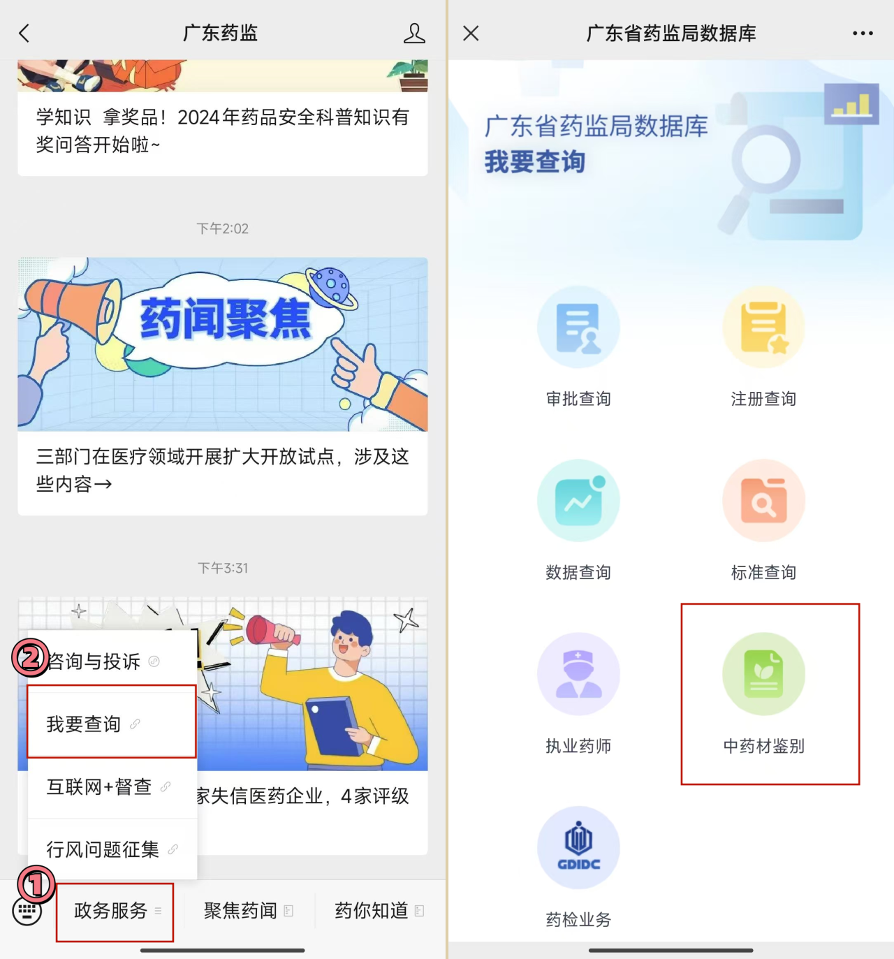 关注“广东药监”微信公众号,点击菜单栏的“AG百家乐娱乐”→“我要查询”,进入“广东AG百家乐数据库”页面,就能看到“中药材鉴别”版块啦!
