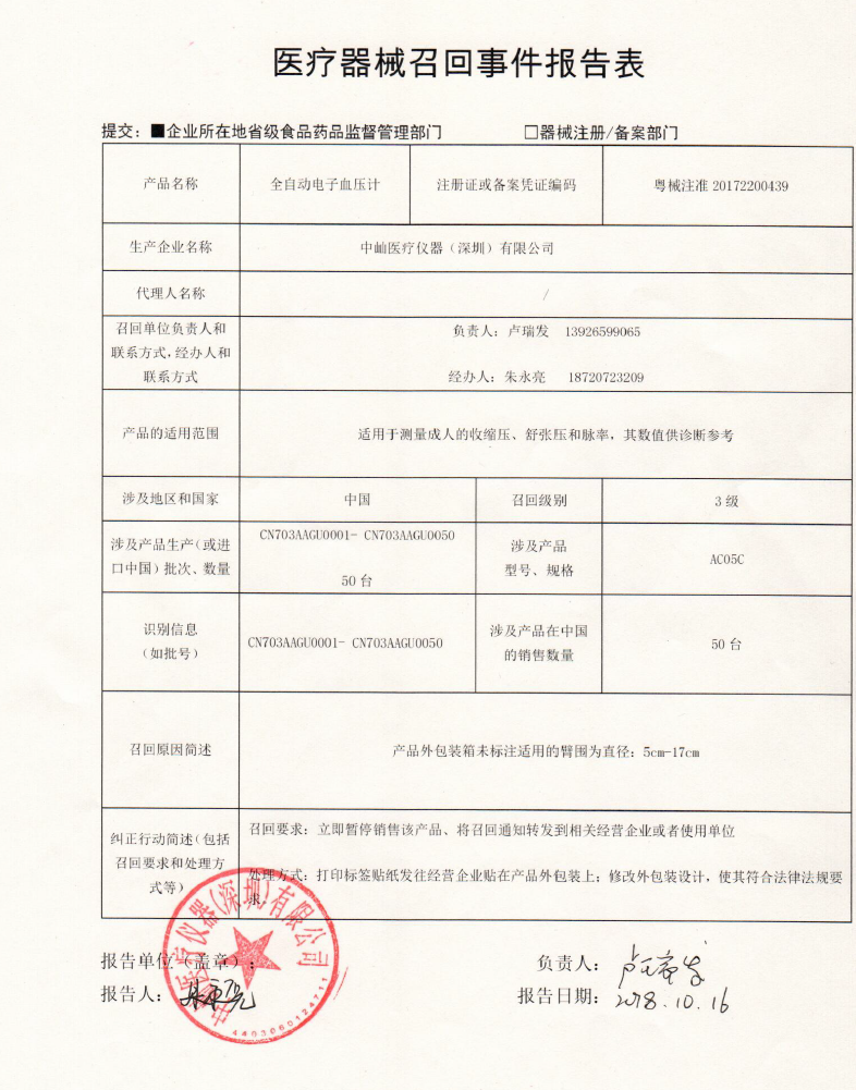 中屾医疗仪器(深圳)有限公司报告,该公司生产的全自动电子血压计经检验,不符合标准规定。中屾医疗仪器(深圳)有限公司主动召回有关产品,召回级别为三级。涉及产品的型号、规格及批次等详细信息见《医疗器械召回事件报告表》。
